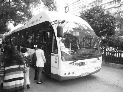 昨日,記者來到卓刀泉南路方家嘴公交車站,這里是596路的起點(diǎn)站。15分鐘后,一輛漂亮的新能源白色公交車開進(jìn)了站點(diǎn)(如右圖)。這輛公交車外觀和普通公交明顯不同,車身以白色為主,前車窗占整個車頭前面的一半,車廂兩側(cè)的車窗也占車身高度的一半,從外觀上看,比普通公交車要大得多。