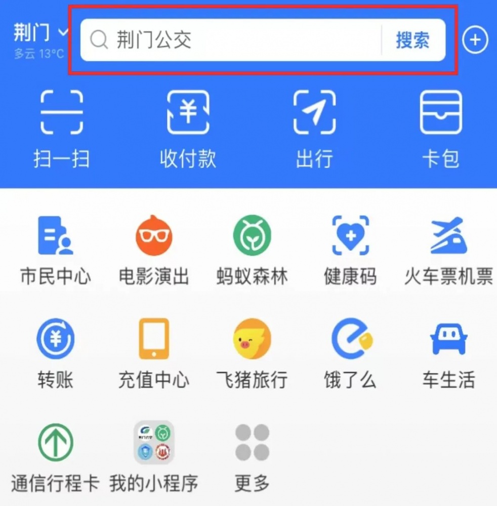 01 打開“支付寶APP”,首頁(yè)搜【荊門公交】