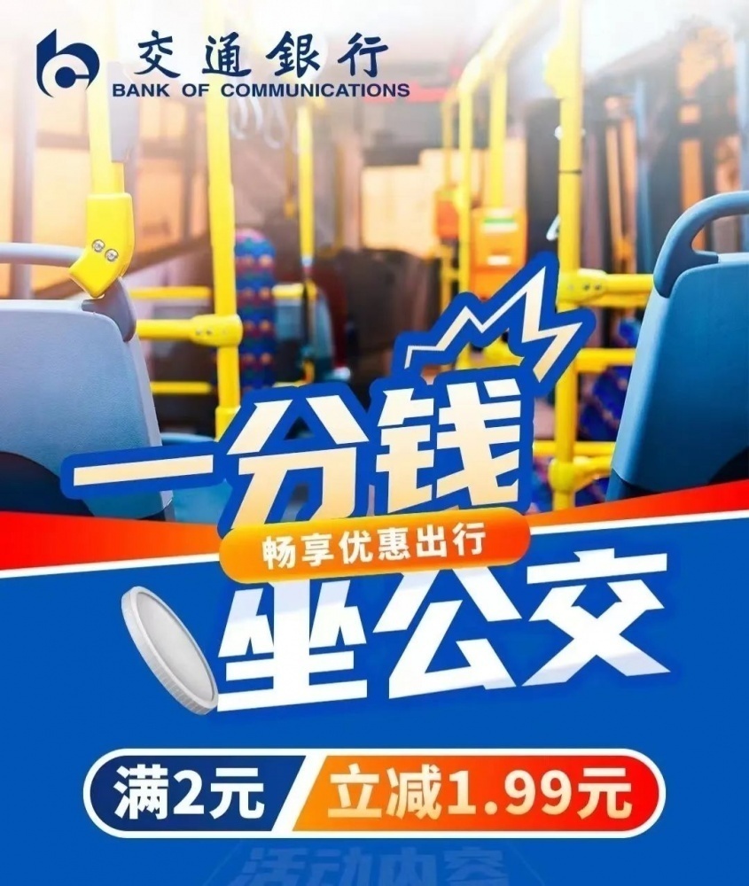 使用交通銀行手機APP出示付款碼乘車可享滿2元立減1.99元優惠?;顒涌偯~10000個,單用戶每日可享受1次優惠,每月可享受10次優惠,名額有限,先到先得。