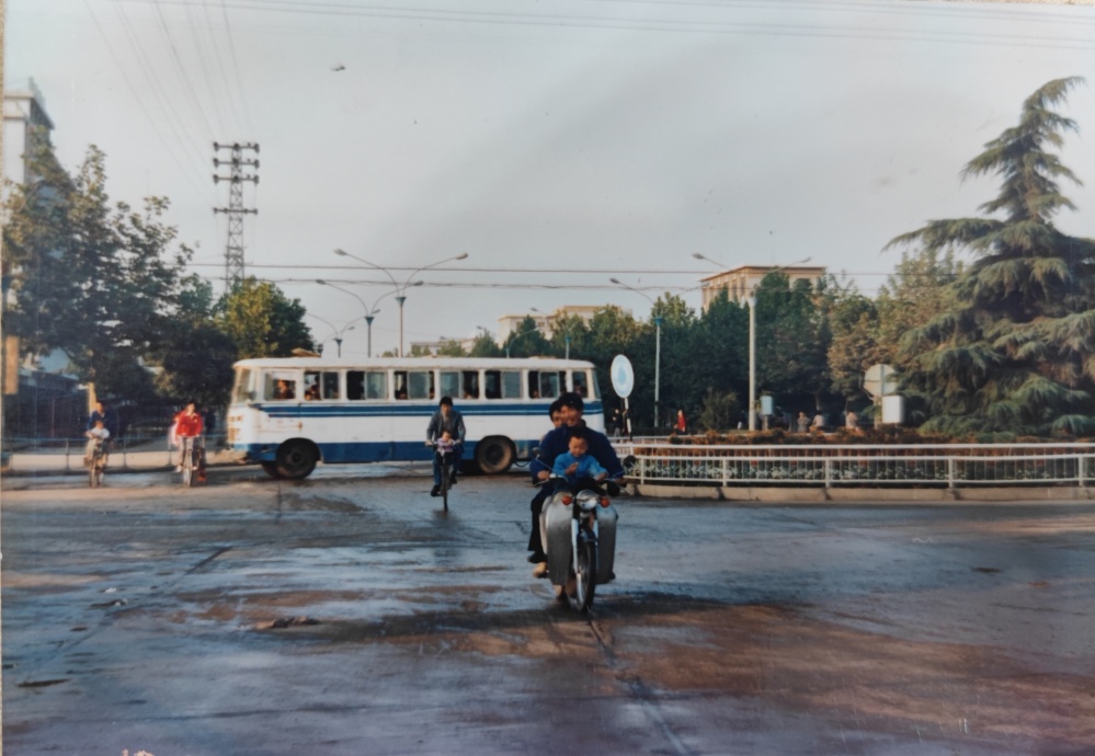 ▲90年代初,荊門市象山大道街景(海慧轉盤)。道路上車輛很少,公交車、摩托車、自行車是主流。