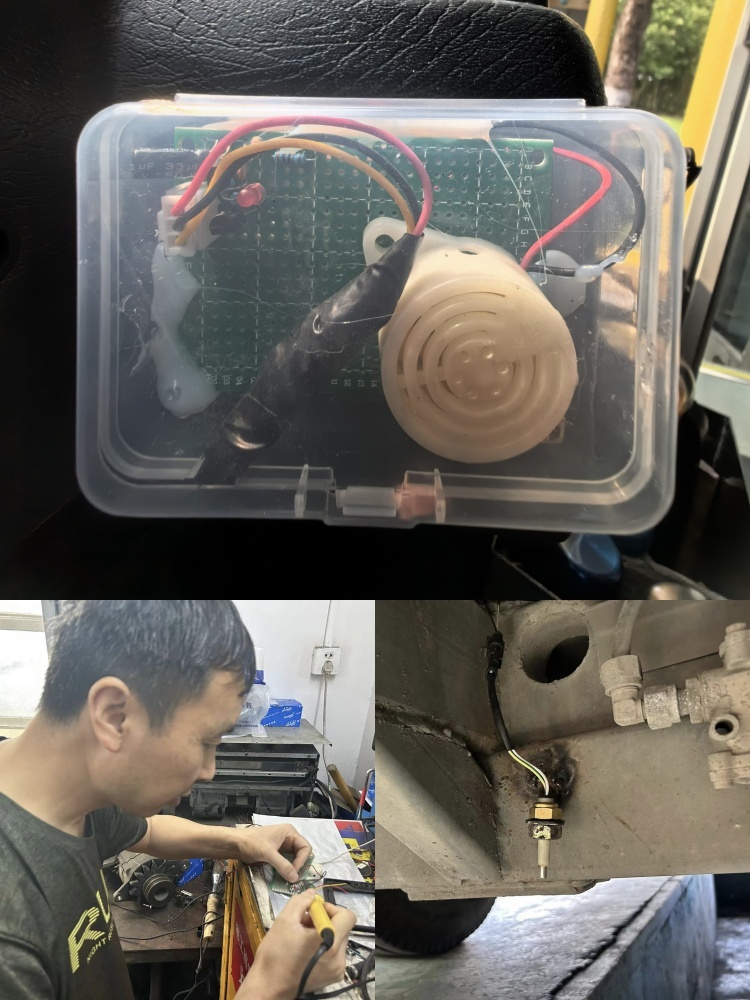 “涉水預警”裝置工作原理:涉水裝置由普通元器件及蜂鳴器焊接而成,在涉水路面通過傳感器泡水觸發蜂鳴器報警,進而提醒駕駛員。