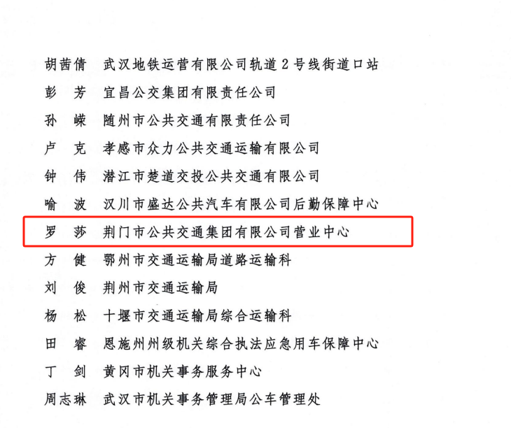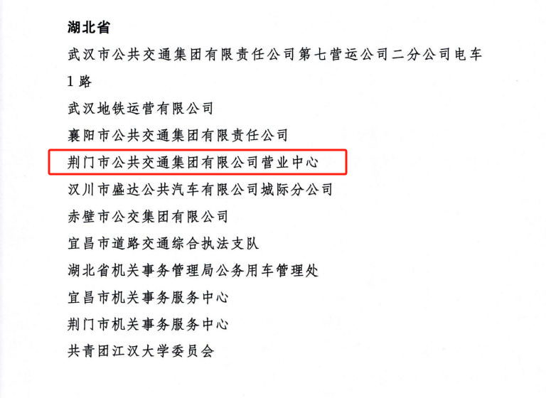 近日,交通運輸部、公安部、國家機關事務管理局、中華全國總工會、共青團中央聯合發出《關于表揚2023年綠色出行宣傳月和公交出行宣傳周活動成績突出集體和個人的通報》。其中,荊門市公共交通集團有限公司營業中心被評為活動成績突出集體,荊門市公共交通集團有限公司羅莎被評為活動成績突出個人。