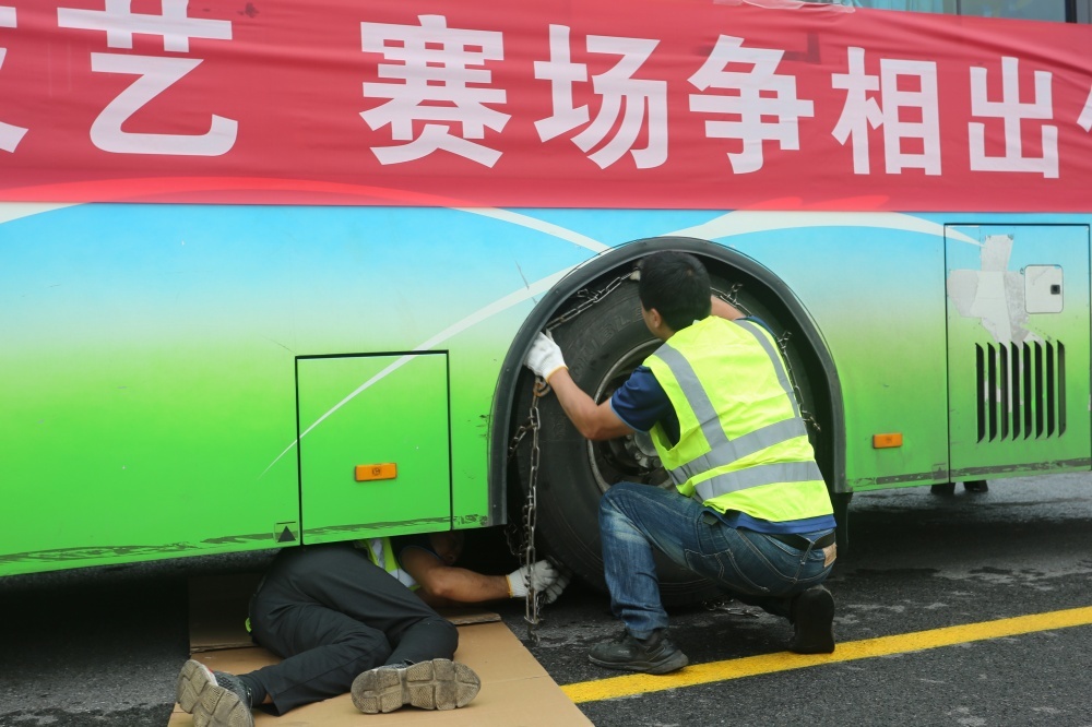 在安裝防滑鏈項目比武現場,市公交集團汽修公司員工王剛、劉小備兩人準備充分、配合默契——先由一人進入車底檢查車況,一人拿出防滑鏈等待安裝。很快,車況檢查結束,兩人迅速將防滑鏈套上輪胎,并將防滑鏈上的橡皮繩捆扎成規則五角形,經檢查內外側松度并無明顯松垮現象后,以3分09秒的成績結束比賽。