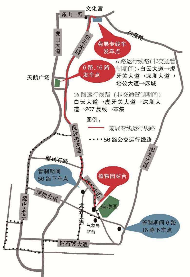 值得說明的是,菊展期間,公交按現行票價收費。菊展前三天,深圳大道東端、培公大道(培公大道與龍井大道交叉路口至培公大道與白石坡大道交叉路口)將實現交通管制,禁止公交車通行,這樣一來,上述四條公交在植物園附近的線路和停靠站點將同步調整,菊展專線公交車將??吭谂喙蟮乐参飯@出口,其他時間停靠在植物園大門附近的植物園站臺。交通管制期間,16路公交車、6路公交車將??吭诎资麓蟮罇|上下車。56路交通管制期間線路不延伸,在培公大道與龍井大道交叉路口上龍井大道,游客可在龍井大道北段上下。荊門晚報訊(記者戴永君)