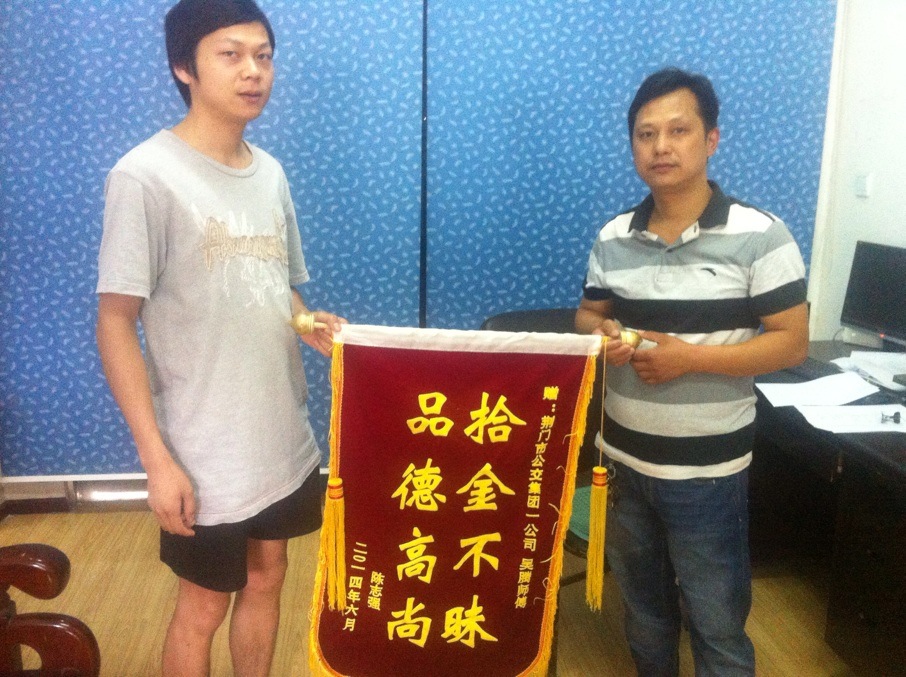 原來,15日下午2時許,1路公交車司機吳騰驅車途經城區長寧大道長寧8號廣場(中百倉儲)公交站點時,在馬路中央撿到一個黑色皮包,并及時上交到公交集團公汽一公司。公司負責人將皮包內身份證信息通過《荊門晚報》及荊門社區網絡媒體發布尋找失主陳先生信息,陳先生看到招領信息后,很快得知錢包的下落了,他說這(找回錢包)是他萬萬沒想到的。18日上午,陳先生順利地從公汽一公司負責人手中認領到丟失的錢包,并特意為吳師傅制作了一面"拾金不昧 品德高尚"錦旗表示謝意。