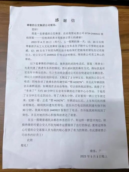 5月4日,小雨,一位熱心乘客走進了荊門市公共交通集團有限公司客服中心,送來一封溫暖的感謝信。信中,她向“五一”節假日期間堅守崗位、積極熱心的公交人表達了濃濃謝意,紙短情長,字里行間流露出款款真情。