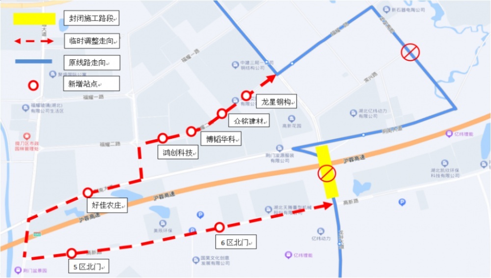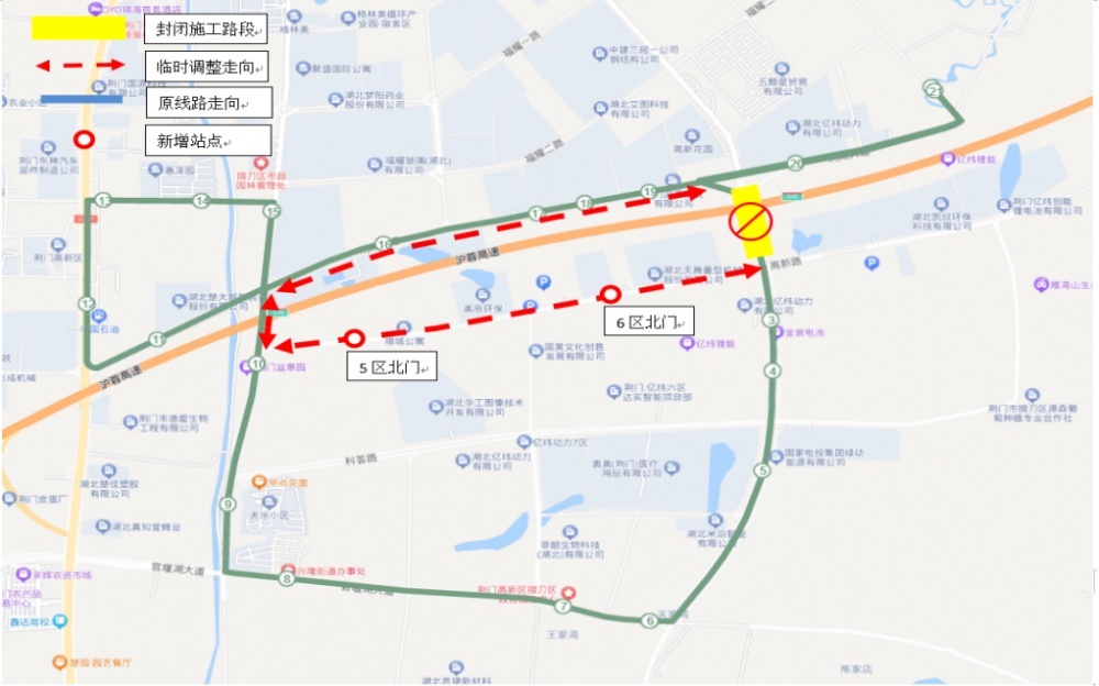 原途經龍井大道—福耀二路—楊樹港路—荊南大道—龍井大道調整為龍井大道—福耀二路—福耀路—荊南大道—交通路—高新路—龍井大道